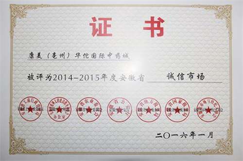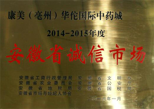 近日,经安徽省工商局、文明办、农委、公安厅、地税局、国税局、市场与经纪人协会评审,康美(亳州)华佗国际中药城获评为“2014-2015年度安徽省诚信市场”。