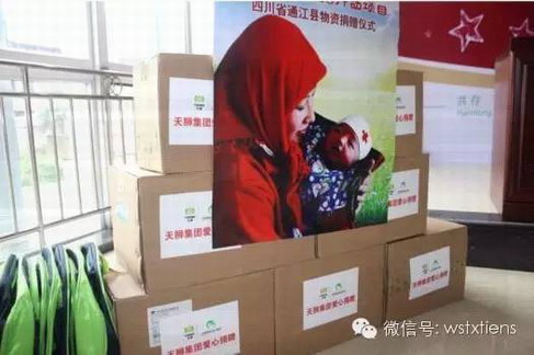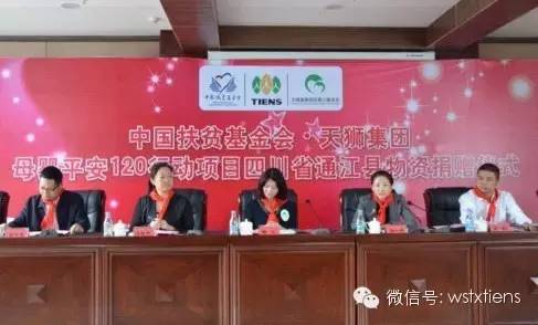 2016年4月23日,由天狮集团、天狮美景国际爱心基金会携手中国扶贫基金会在四川举办母婴平安120行动项目通江县物资捐赠仪式,天狮集团捐赠价值100万元的爱心健康产品,用于改善该地区贫困家庭的儿童健康问题,帮助贫困儿童提升身体健康水平和生活水平。天狮集团大中华区副总裁,中国扶贫基金会母婴项目部主任助理王珞玮,通江县人民政府郭红梅副县长,通江县卫计局陈明春局长,县妇幼保健院李兵院长等相关领导以及通江地区的天狮志愿者们参加了本次爱心活动。