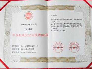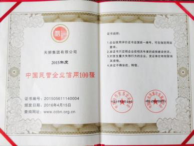 由中国合作贸易企业协会、中国企业改革与发展研究会、商务部研究院信用评级与认证中心联合开展的中国企业信用评价工作中,天狮集团再次荣获2015年度“中国企业信用500强”荣誉称号,“中国民营企业信用100强”以及“中国制造业企业信用100强”殊荣。