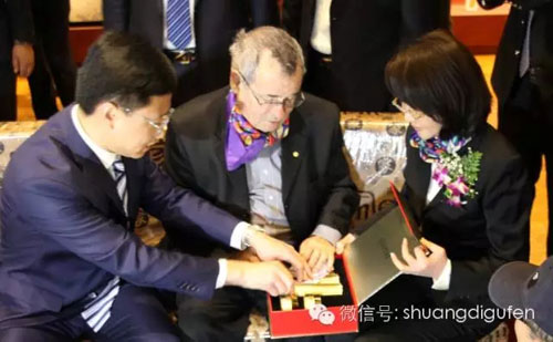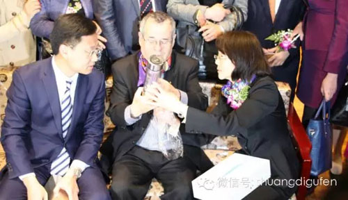 潘晓非向亚利耶•瓦谢尔教授赠送了知水微型富氢制水器和金派核蛋白系列化妆品。