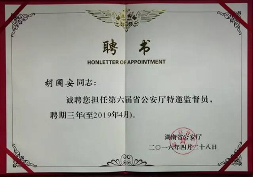 胡国安再次受聘为湖南省公安厅特邀监督员