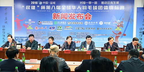 4月27日10:30,“权健”杯第八届华人羽毛球团体锦标赛新闻发布会在江苏省盐城市体育馆隆重举行。盐城市人民政府副市长邹毅实,盐城市政府副秘书长仇鼎文,盐城市体育局局长杨玉成,盐城市羽毛球运动协会会长叶守民,盐城市羽毛球协会常务副会长戴刚,权健集团华东国际会议中心总经理郭晓萍出席了本次发布会。新华网,中新网,中江网,扬子晚报,江苏广播电视台,江苏法制报,中国体育报、盐城广播电视台、盐城晚报等社会各界数十家主流媒体进行了全面报道。