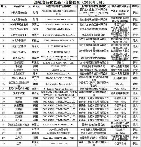 质检总局公布3月进境不合格食品化妆品名单