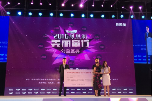 2016年4月23日,由凤凰网、凤凰卫视联合主办的凤凰网“美丽童行”厦门公益慈善夜在厦门国际会议展览中心完美落幕,共募集善款逾903万元,分别用于中华少年儿童慈善救助基金会、春晖博爱儿救助公益基金会、以及中国少年儿童文化艺术基金会旗下的“女童保护”基金。