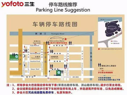 驱车参加嘉年华的营销伙伴(含私家车、租车),请将车辆停在下方车辆停车路线图上规定的相应停车场(嘉年华当天世博大道大巴车禁止通行),下车后统一步行前往奔驰文化中心参会。