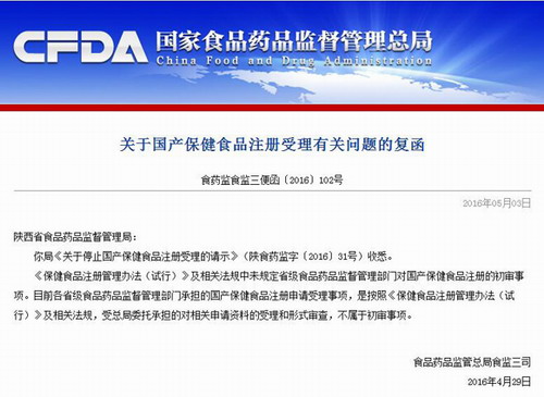 5月3日,CFDA在其官网公布了《关于国产保健食品注册受理有关问题的复函》(食药监食监三便函〔2016〕102号)。