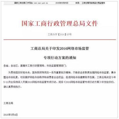 为贯彻落实好党中央、国务院领导同志一系列重要批示精神,不断依法依职责加强网络市场监管,集中整治市场乱象,切实维护网络市场秩序和消费者合法权益,促进网络市场健康有序发展,工商总局决定今年5-11月全系统深入开展2016网络市场监管专项行动。现将《2016网络市场监管专项行动方案》印发给你们,请认真贯彻执行。