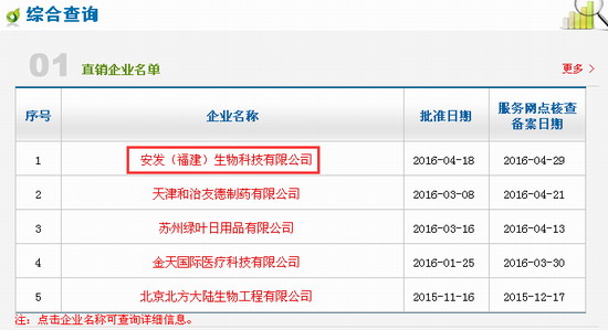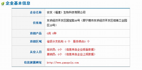 5月10日,商务部直销行业管理信息系统发布安发(福建)生物科技有限公司获得直销经营许可证。信息显示,安发(福建)生物科技有限公司是于2016年4月18日获得批准,4月29日备案公示。安发(福建)生物科技有限公司获批省级直销分支机构、服务网点、直销产品、直销培训员信息目前暂未公布。详情如下: