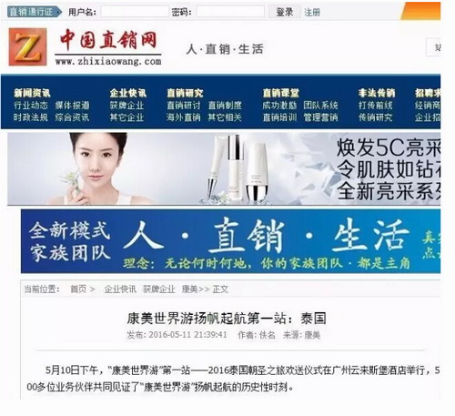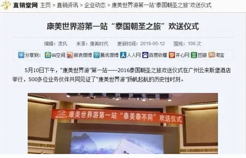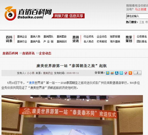 在“康美世界游”出发当天,直销百科网、当代直销新闻、道道舆情、中国直销网等媒体就刊发了当天“康美世界游”的欢送仪式及欢迎晚宴报道,在业界引起强烈关注。
