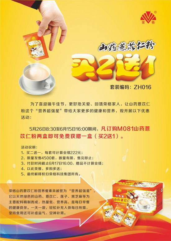 喜迎端午 荣格开展山药薏苡仁粉买二送一活动