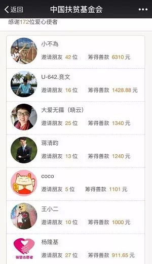 在微信在线捐的页面上,有这样一批人,他们不但自己付诸行动,还号召很多微信好友一起加入进来。微信昵称“小不為”邀请了42位好友,共计筹得了善款6310元。“竞文”邀请了16位好友,筹得善款1428.88元。“大爱无疆(小云)”邀请了25位好友,筹得善款1340元,蒋清昀邀请了13位好友,筹得善款1240元……像这样的爱心使者,有172位,邀请好友虽然是一个“小小”的举动,但他们不以善小而不为,这,是一群多么有爱的葆婴人。