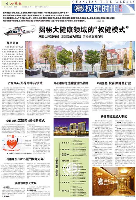 2016年5月27日,《今晚报•权健时代周刊》整版刊发了题为《揭秘大健康领域的“权健模式”》的专题报道。文章详细阐述了权健集团作为中国大健康产业集群中的生力军,成立十二年以来,始终秉持和恪守良心企业的发展准则,以直销模式为基础,依托肿瘤医院、全民皆医网、医疗救助爱心工程、药材基地等实体基础,覆盖从预防到治疗的整个需求,涉及保险到金融等多个创新商业模式的融合,正在一步步完善自身产业链条,形成“权健模式”。