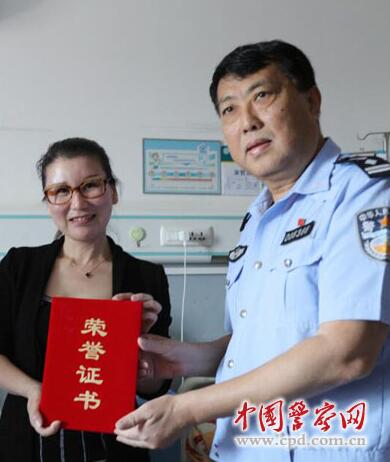 郑州市公安局交警支队政治部主任牛万宝向周健颁发捐赠证书