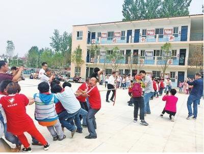 捐赠仪式结束后,黄店镇中心小学的学生还和安利志愿者们一起在音乐中玩背靠背、两人三足等游戏,并举行了拔河比赛(如图)。