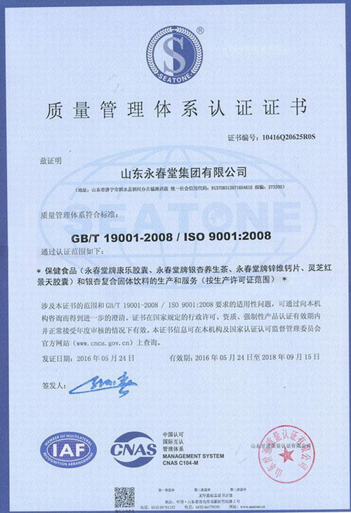 在公司全体干部员工的不懈努力下,经过认证公司专家的全面、严格、细致的指导和审核,确认我公司质量管理体系符合 ISO9001:2008质量体系标准的要求,并于2016年5月24日,向我公司正式颁发了ISO9001质量管理体系认证证书。
