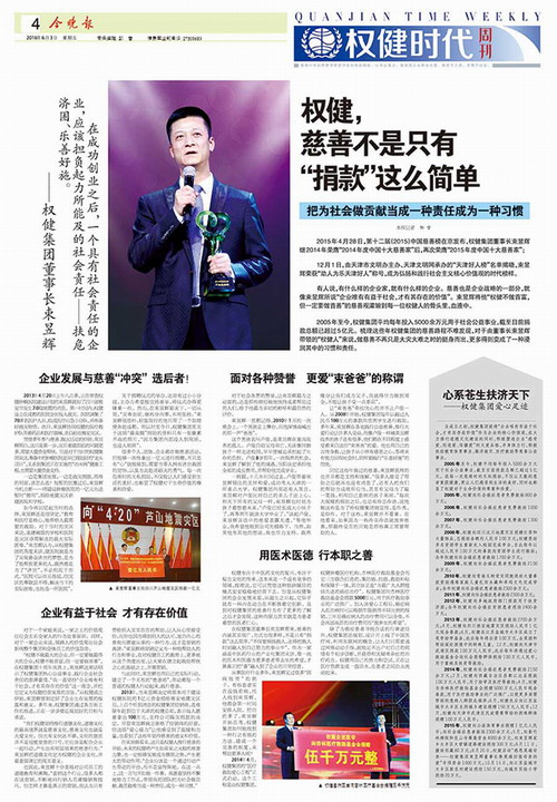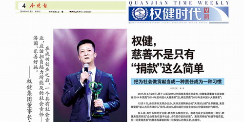 2016年6月3日,《今晚报•权健时代周刊》整版刊发了题为《权健,慈善不是只有“捐款”这么简单 把为社会做贡献当成一种责任成为一种习惯》的专题报道。