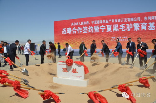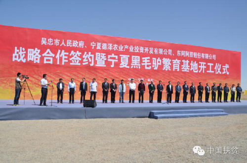 5月10日,吴忠市人民政府、宁夏德泽农业产业投资开发有限公司、东阿阿胶股份有限公司战略合作签约暨宁夏黑毛驴繁育基地开工仪式在同心县下马关镇举行。此次合作是新能源企业与中药龙头企业的强强联合,通过打造现代化、集约化、规模化的新能源养殖产业园区,带动建档立卡贫困户脱贫致富,开创了产业精准扶贫的新模式。