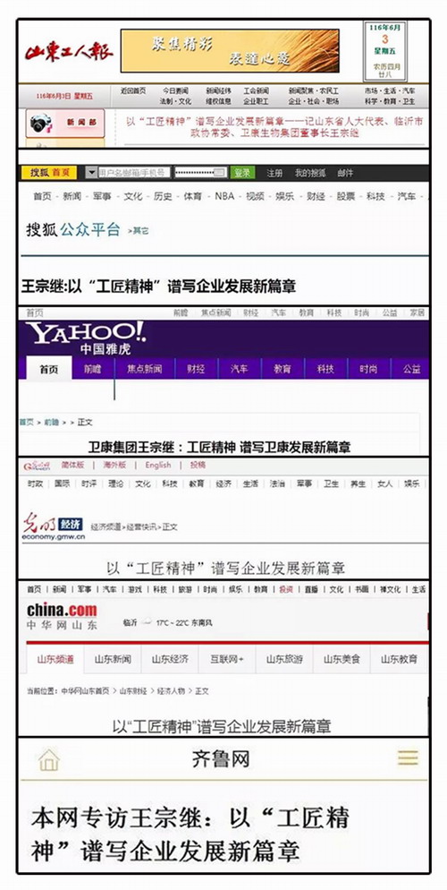 山东工人报在头版显要位置刊发《以“工匠精神”谱写企业发展新篇章——记山东省人大代表、临沂市政协常委、卫康生物集团董事长王宗继》,全文如下:
