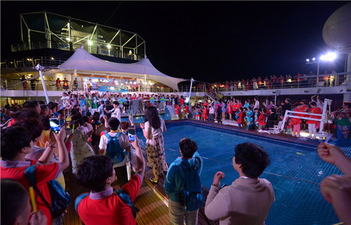 不仅如此,伙伴们还在福冈当地品尝了各种各样的日本特色美食,寿司、咖喱等等,伙伴们的友谊和感情也在快乐和幸福之中得到巩固和升华,可谓真正是实现了“看遍天下美景、尝遍天下美食、交遍天下朋友”的美好愿望。 晚上,伙伴们返回邮轮,日本“嗨”完,回到船上继续“嗨”。为了让伙伴们尽情尽兴,邮轮方特别邀请了中国好声音知名学员李文豪为伙伴们激情献唱。 不仅如此,多位伙伴还被邀请上台玩互动游戏,惹得台下掌声连连,笑声不断,现场真可谓是乐翻了天,嗨翻了地!