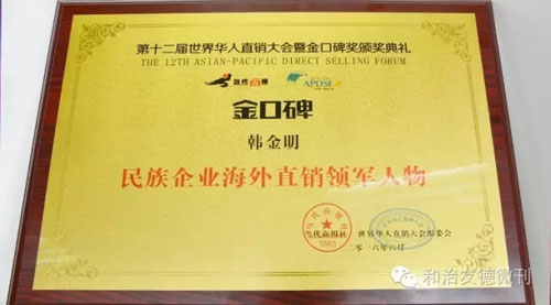 会议上,主讲嘉宾和治友德董事长韩金明借力“一带一路”国家战略,中国直销企业布局海外市场的机遇与陷阱为题,进行了重要演讲,对近年来国家政策影响国内直销发展的趋势进行解读,并将自身及企业多年的海外运作经验与在座嘉宾进行分享,助力国内企业开发海外市场,引发了现场热烈的讨论。在万众期待之下,和治友德喜获“民族企业海外直销领军人物”及“亚太区最具合作价值企业”两大嘉奖。