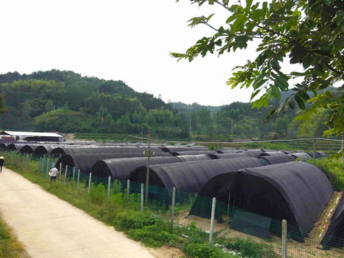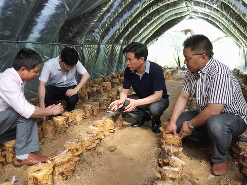 余董认真听取了桑黄基地负责人的生产情况,对于桑黄基地生态条件、大棚标准化、桑黄成活率、药材品质表示满意,鼓励基地人员认真维护、勇于创新,特别对于基地认真执行不施农药、采用人工方法灭虫予以表扬。