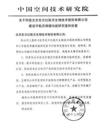 东方红公司与中国空间技术研究院签署了《空间生物技术优先受让/优先使用长期合作之框架协议》,享有中国空间技术研究院独有的空间搭载资源、全球领先的空间诱变、分离、提纯技术,为航天健康科技产品的持续研发奠定了雄厚的科研基础。