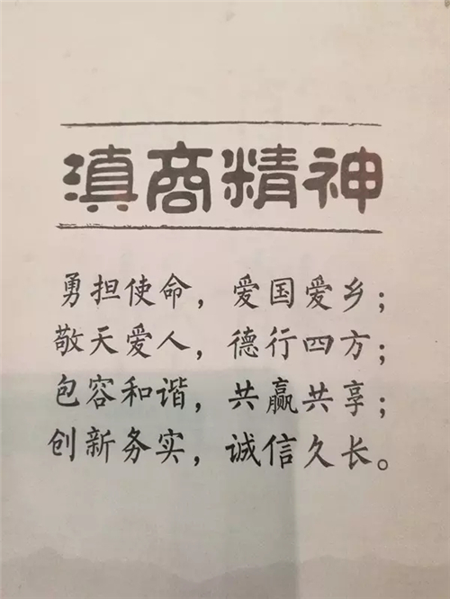 “勇担使命,爱国爱乡;敬天爱人,德行四方;包容和谐,共赢共享;创新务实,诚信久长。”2016年6月13日,作为第4届南博会系列活动之一的“2016滇商论坛”在昆明海埂会堂成功举办,本次论坛为首届世界滇商论坛,其最大意义就是开创性地定义了上述32字的“滇商精神”,并首次发表签署了《滇商宣言》。