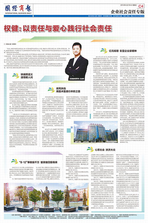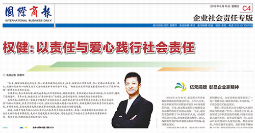 2016年6月16日,《国际商报》通版刊发题为《权健:以责任和爱心践行社会责任》的专题文章,详实记述并盛情讴歌了权健集团积极践行企业社会责任,传递社会正能量所做出的卓越贡献。