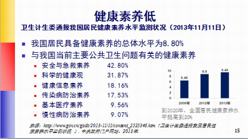 陈耀平说,营养是生命的物质基础,是关系我们每个人、每个家庭乃至国家持续健康发展的重要基石之一。国家卫计委于2013年开展的“中国居民健康素养调查”显示,我国15-69岁居民具备健康素养的总体水平为9.48%,因此提高居民健康素养水平的任务仍然艰巨。