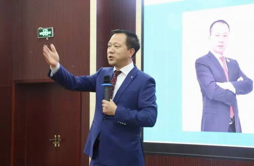 卫康直销市场总裁裴洪涛首先上台做了慷慨激昂的演讲,他从卫康文化、人才战略及营销模式等方面,分享了选择卫康的理由。