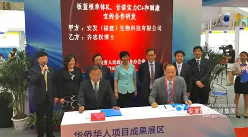 会上,高益槐教授和厦门大学医学院副院长齐忠权教授进行了海外华侨华人项目成果签约,双方就板蓝根单体K、甘诺宝力C+和丽康宝三款产品的深度研发达成合作意向。为安发(福建)生物科技有限公司的新产品开发和现有产品复方改进提供了科研支撑。