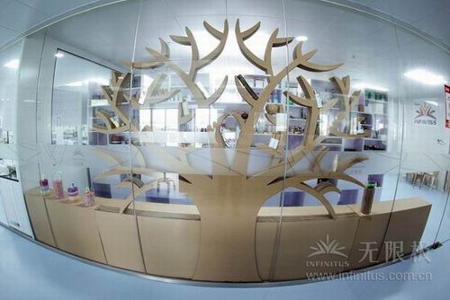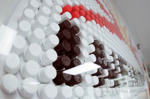 再猜猜这是什么?对!是各种颜色的牙膏盖子,拼出了无限极的LOGO图案,挂在墙上十分醒目。