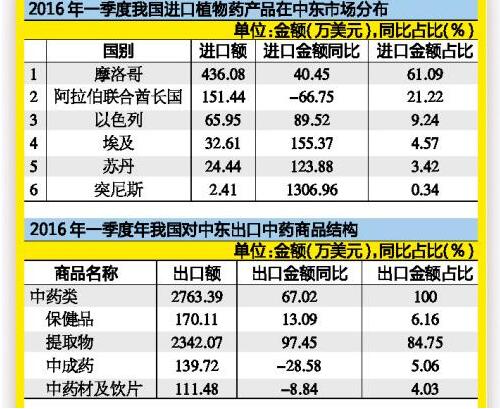 今年第一季度,我国对中东地区的中药进出口贸易额达到3477.19万美元,同比增长33.44%,而同期的中药贸易整体同比下降13.94%,其中,出口额为2763.39万美元,同比增长67.02%。而我国从该地区的植物药进口则达到713.79万美元,同比下降24.97 %。总体来看,我国对中东地区的中药进出口贸易增长主要为出口增长。