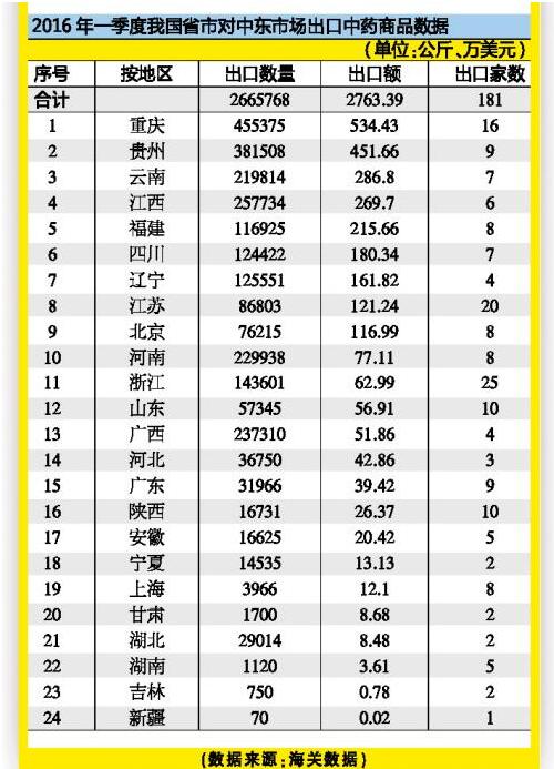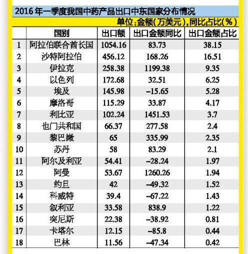 我国对中东地区出口最多的为植物提取物,过去占整个中药对中东地区出口的46.11%,到2016年第一季度,这一比重已提高至84.75%。目前我国对中东地区出口的主要中药商品包括桂油、清凉油、老鸹草油、蜂蜡、胡椒薄荷油、蜂王浆制剂和蜂花粉等。