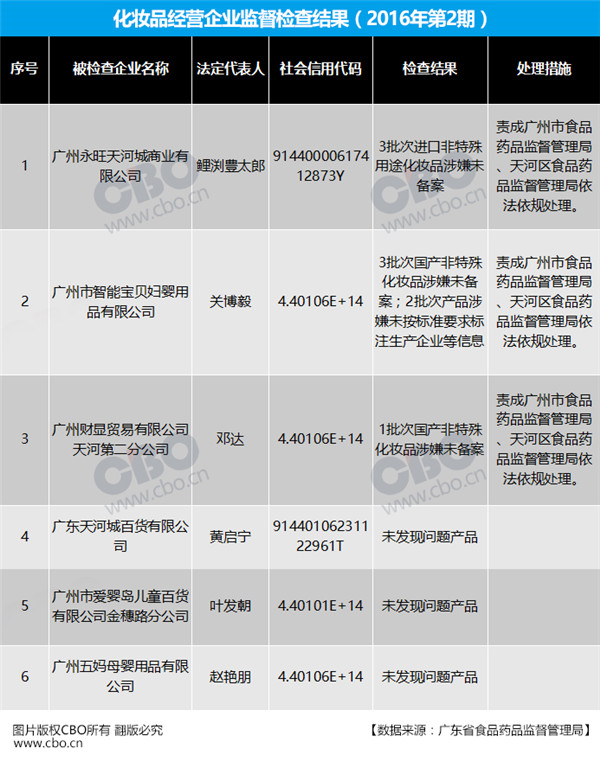 公告显示,广州永旺天河城商业有限公司3批次进口非特殊用途化妆品涉嫌未备案;广州财显贸易有限公司天河第二分公司1批次国产非特殊用途化妆品涉嫌未备案;广州市智能宝贝妇婴用品有限公司3批次国产非特殊用途化妆品涉嫌未备案、2批次产品未按标准要求标注生产企业等信息,以上产品已当场责令企业改正并做下架处理。此外,广东天河城百货有限公司、广州市爱婴岛儿童百货有限公司金穗路分公司、广州五妈母婴用品有限公司3家被抽查单位未发现违法违规产品。
