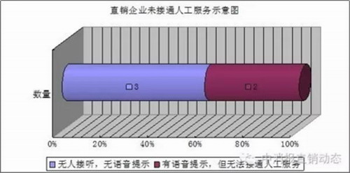 直销企业的客户服务电话是对外服务的交流渠道。作为和和消费者联系的桥梁,应该努力提供更加便捷、规范、高效的服务。上述企业中,客服电话是400电话的有9家,调查发现,在工作时间内,15家直销企业的客服电话有10家能够接通人工服务,接通率达到了66.7 %。有5家直销企业的客服电话未能接通人工服务。