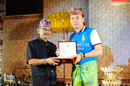 晚宴现场,三生(中国)市场运营中心总裁孙鹏博代表公司致辞,他首先向追随梦想不断开拓的三生营销精英们致以诚挚谢意,并向巴厘岛政要的出席表示热烈的欢迎。孙总回忆了曾经与伙伴们一同走过的海外旅游时光,并表示这些天与伙伴们在巴厘岛度过了非常愉快的时光。他希望,伙伴们能将这些天的收获转化成助力事业发展的持续动力。随后,苏部长致辞,他希望三生人能带着越来越多的事业伙伴来到巴厘岛,享受这一份美好与惬意。随后,孙总与苏部长相互交换礼物。