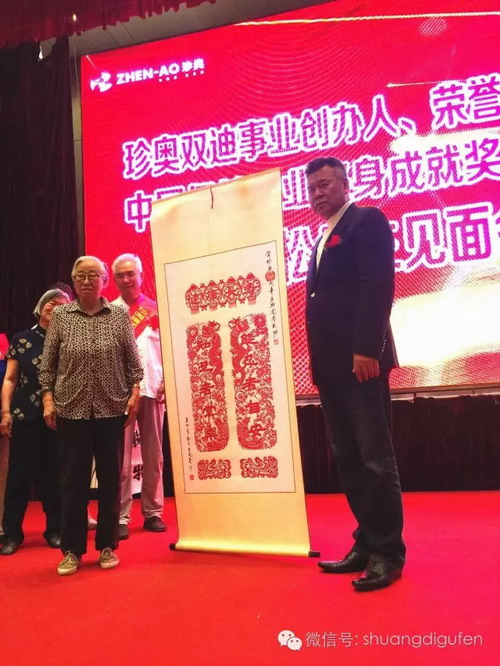 王凤英家人亲手剪了“能忍者自安,知足者常乐”的剪纸对联送给了陈玉松。这位78岁的家人结缘珍奥9年,全家人都使用珍奥双迪产品,他们非常感谢珍奥双迪为他们的健康生活增添了幸福和快乐。75岁的程小明家人亲手缝制了鞋垫送给陈玉松,她把结缘珍奥双迪10年的感激之情针针线线都缝在了鞋垫中。陈玉松接过程小明手中的鞋垫,高高举起向她表示感谢。