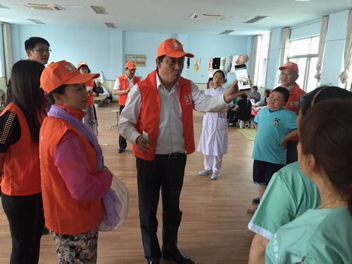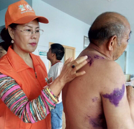 天津荟生家人张桂英为受伤群众涂抹芦荟胶