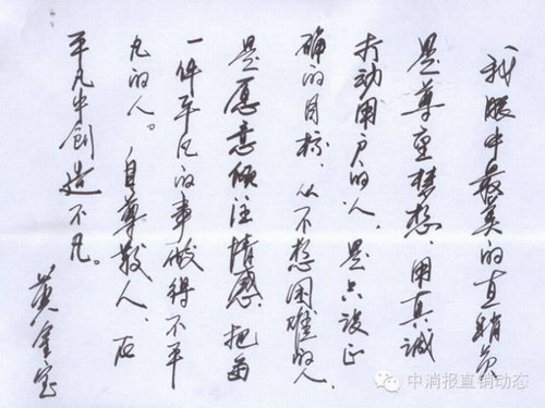 资料图片。图为黄金宝先生为2015年的寻找最美直销员活动题词