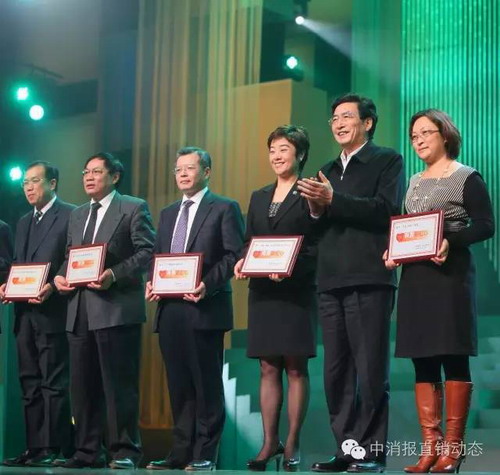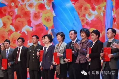 2010年,时任北京市市长郭金龙给安利北京分公司颁发“商界彩虹心”奖。图为翟明翯女士(右三)在领奖台上