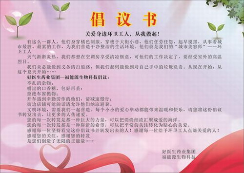 近日,好医生药业集团一万余名员工和数十万终端客户通过微信传递了“关爱身边环卫工人”的倡议书。好医生药业集团携手旗下的福能源生物科技有限公司通过微信朋友圈,向员工、经销商和供、销渠道全体人员发起的通过微信朋友圈传递“关爱身边环卫工人,关爱环保,从我做起”的倡议。