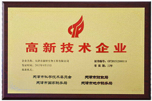 2016年6月30日,经天津市科学技术委员会、天津市财政局、天津市国家税务局和天津市地方税务局严格的测评和审批流程,康婷公司凭借雄厚的技术实力通过层层审核,最终荣获国家“高新技术企业”荣誉称号。