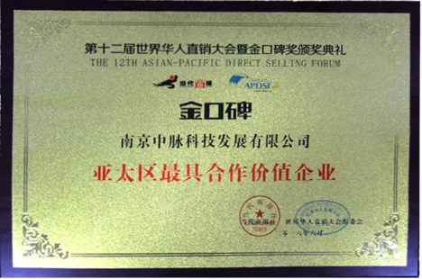 中脉作为知名直销企业,受邀出席本次会议,并在6月7日晚上举办的“金口碑”颁奖典礼上,被大会组委会授予“亚太区最具合作价值企业”的荣誉称号,同时,中脉“唯食帮”被评为“亚太区最具品牌价值明星产品”。