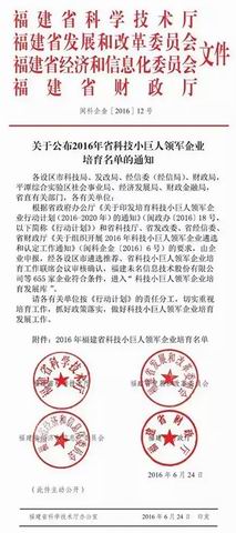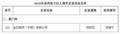 日前,福建省科学技术厅、福建省发展和改革委员会、福建省经济和信息化委员会、福建省财政厅联合发布了《关于公布2016年省科技小巨人领军企业培育名单的通知》(闽科企金[2016]12号),金日制药(中国)有限公司等655家企业入围“省科技小巨人领军企业培育名单”。