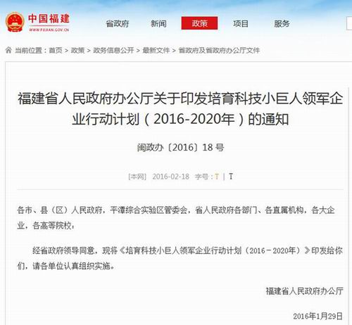 福建省培育科技小巨人领军企业行动计划(2016-2020年)