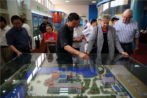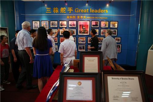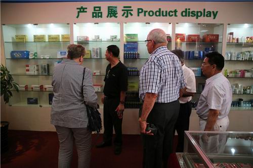 (董事长引领摩根校长一行参观三株集团产品展示区)