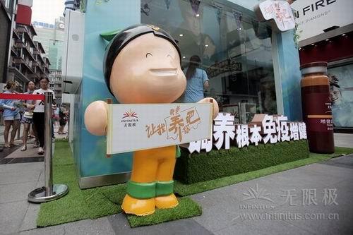 不过,正因为春熙路的繁华,想引起路人的注意也并不是那么容易!无限极“养吧”靠的是高颜值来吸引眼球——馆外看,落地玻璃打造的方形屋子上“种”满了杭白菊、枸杞、决明子、香菇等各种巨型中草药模型,和憨态可掬的阿健公仔相映成趣,让路人大呼“好萌”!