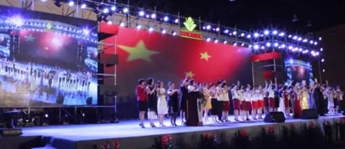 ▲公司领导、高级经销商代表与参会的家人齐声高唱《歌唱祖国》