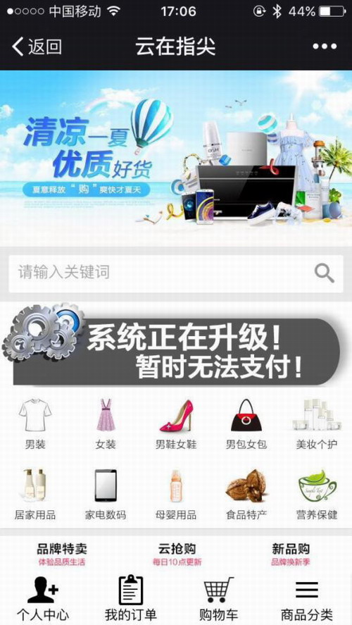 亿邦动力网登录云在指尖微商城,发现云在指尖的支付功能确实已被关闭,用户下单支付时无法选择支付通道。携优品商城首页爆出404错误,无法登陆。
